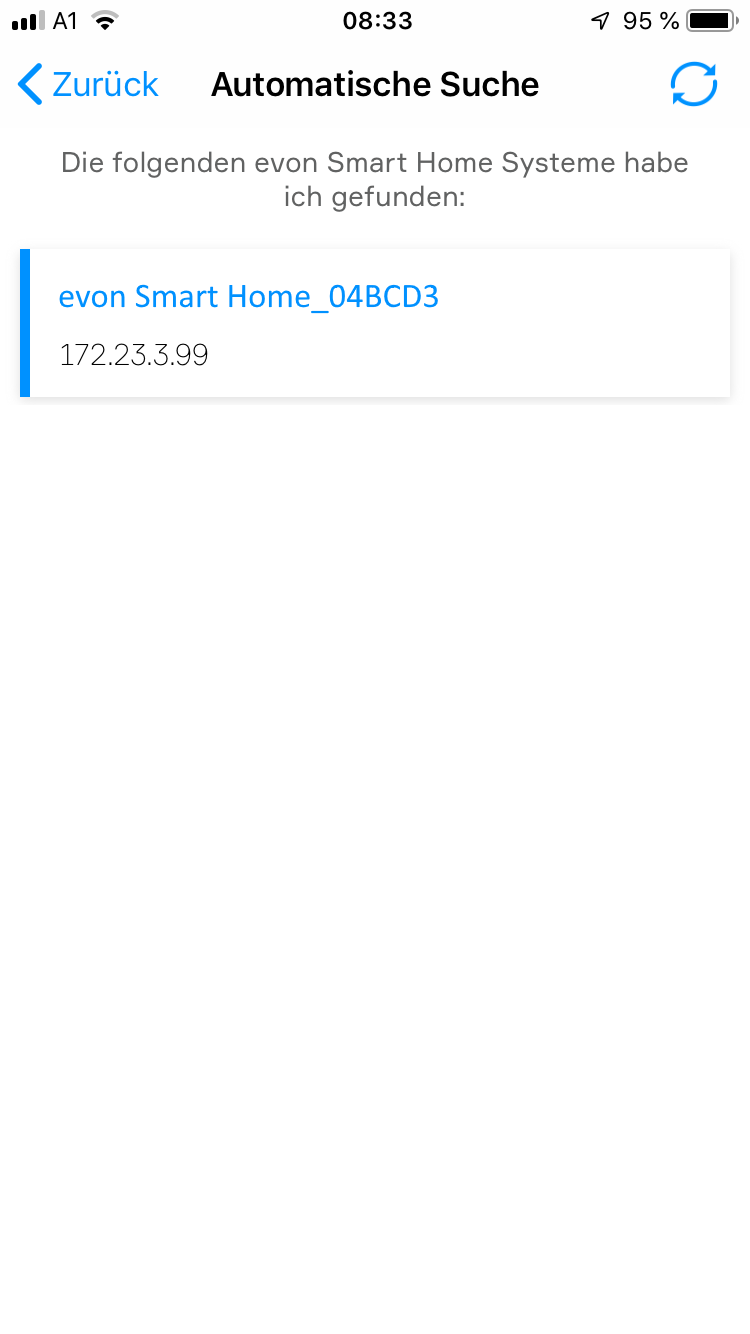 Die evon Smart Home App sucht nun nach allen Systemen, die sich in Ihrem Netzwerk befinden. Sobald eines oder mehrere gefunden wurden, werden diese zusammen mit der zugewiesenen IP Adresse angezeigt. Ihr neues System wird bei Auslieferung mit dem Namen evon Smart Home + eindeutiger Identifikationsnummer (z.B.: evon Smart Home_1234AB) in Ihrer App gelistet. Die Benennung kann später von Ihnen geändert werden.