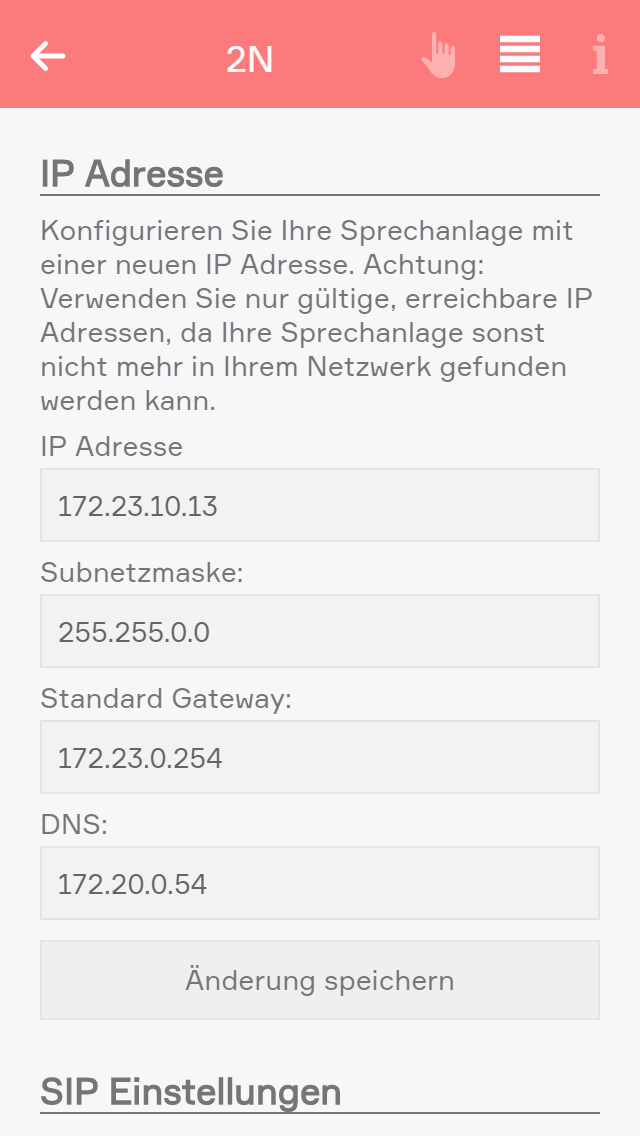 Wurde die Sprechanlage manuell von Ihnen angelegt, müssen Sie in die Einstellungen gehen und die IP Adresse eintragen. Nutzername und Passwort sind bereits ausgefüllt, können aber jederzeit geändert werden, falls Sie diese in der Türsprechanlage angepasst haben.