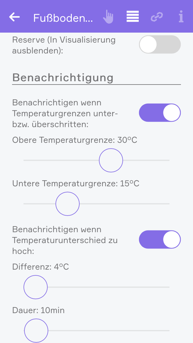 Unter "Einstellungen" kann die Solltemperatur für das Warmwasser angepasst werden und wenn mehrere Zonen vorhanden sind die Zone ausgewählt werden, welche für die Anzeige im Object Panel verwendet werden soll.
