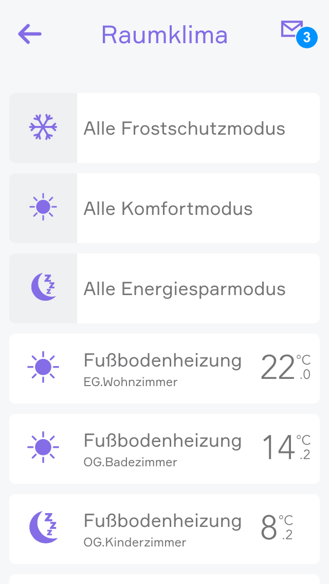 In der App sehen Sie eine Liste mit Zentralfunktionen und darunter eine Liste Ihrer Elemente – diese entspricht den Kanälen Ihrer evon Smart Home Module. Die Zentralfunktionen werden in der Dokumentation der jeweiligen App genauer beschrieben.