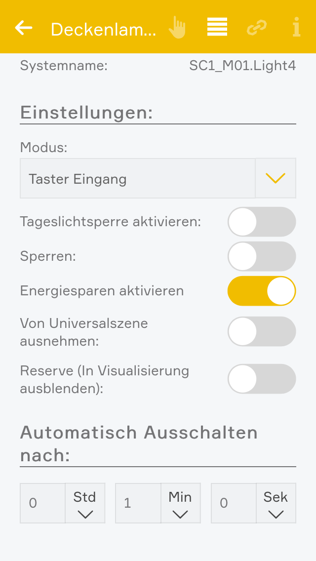 Hier können Sie einstellen, ob dieses Licht über einen Taster oder Bewegungsmelder gesteuert wird. Wählen Sie als Modus „Bewegungsmelder“ aus, so werden Ihnen weiter unten Einstellmöglichkeiten zur Einstellung der Leuchtdauer eingeblendet.