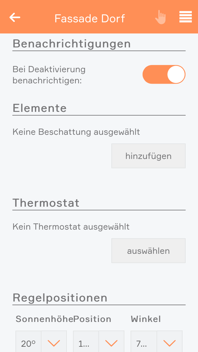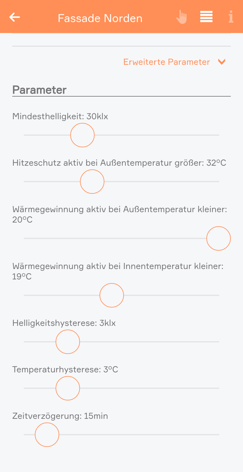 Haben Sie den Hitzeschutz aktiv, werden alle Beschattungselemente Ihrer Fassade komplett geschlossen, sobald die eingestellte Außentemperatur überschritten wird.