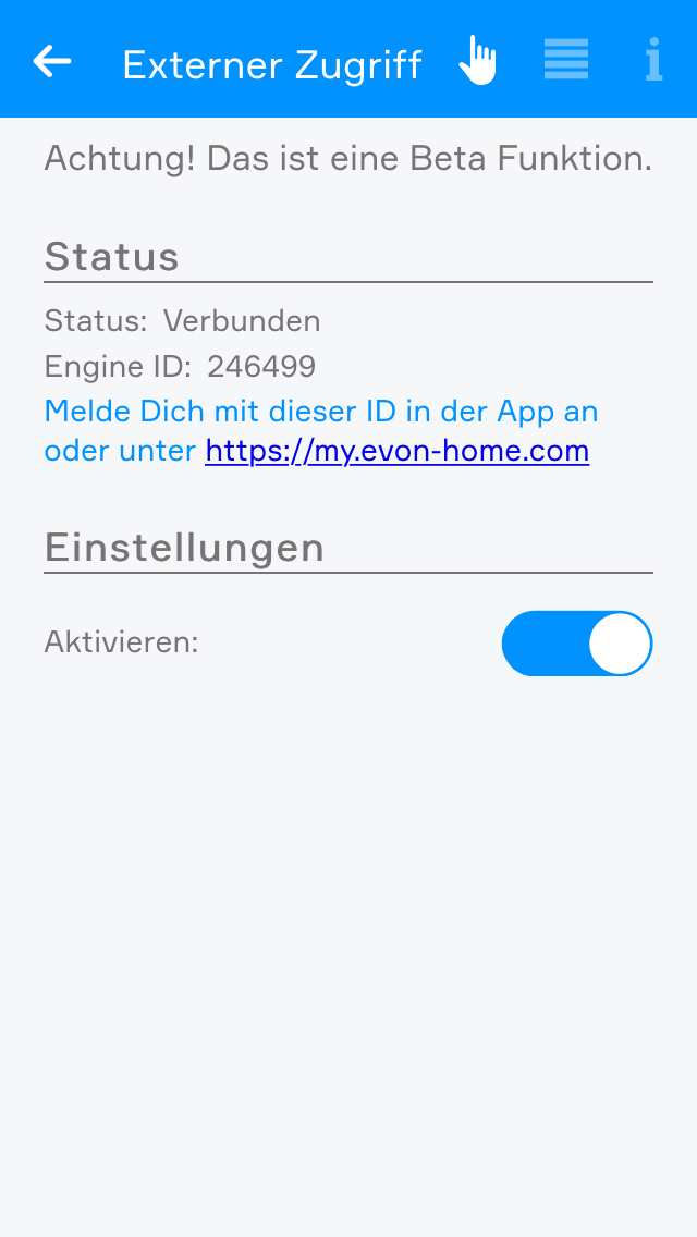 Hier können Sie einstellen, ob Sie über das Internet Zugriff auf Ihr evon Smart Home haben. Haben Sie den externen Zugriff aktiviert, können Sie mit Ihrer evon Smart Home Id von überall auf Ihr evon Smart Home zugreifen. Ihre Daten werden hierbei zwar über das Internet kommuniziert, diese Verbindung ist aber verschlüsselt (https) und es werden nirgends Daten zwischengespeichert - Das Sicherheitsniveau entspricht dem von aktuellen Telebanking-Systemen.