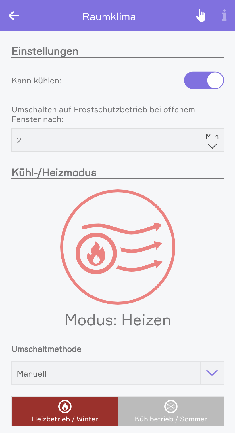 Wenn Ihr Heizsystem einen Kühlbetrieb unterstützt, können Sie diese Option aktivieren. Achtung! Sollte Ihre Heizung nicht für den Kühlbetrieb ausgelegt sein, könnte es zu Fehlfunktionen kommen. Bitte wenden Sie sich bei Unklarheiten an einen Fachmann.