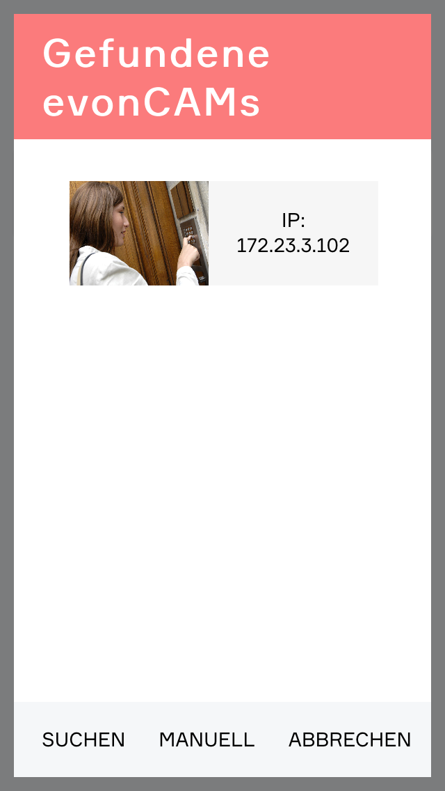 Im nun erscheinenden Popup werden automatisch alle gefundenen evonCAMs gelistet inklusive Vorschaubild. Sobald Ihre Kamera in der Liste erscheint, können Sie sie direkt auswählen. Sie wird nun im System hinzugefügt und kann sofort verwendet werden.