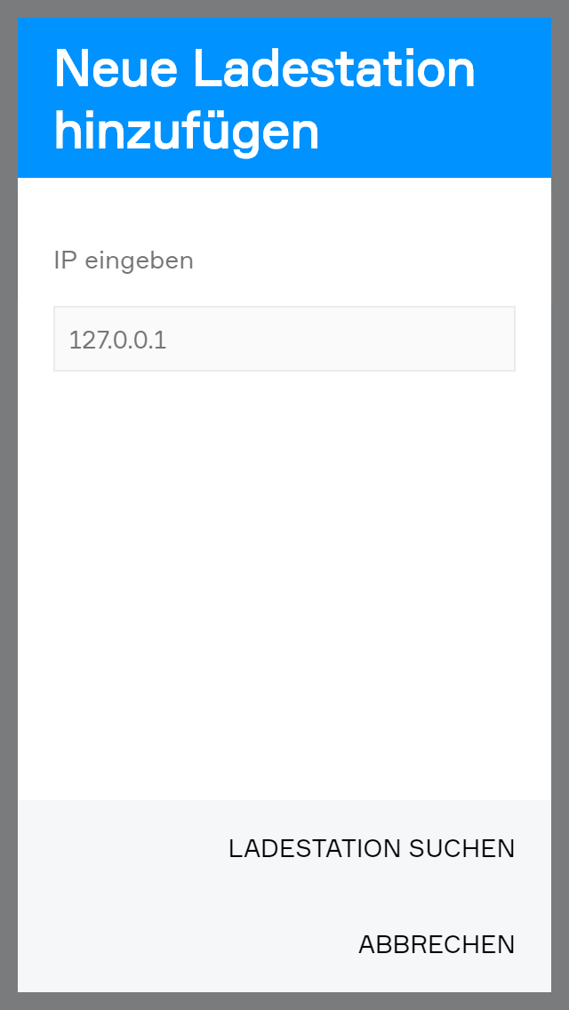 Danach öffnet sich ein Popup, in dem die IP-Adresse der Ladestation anzugeben ist. Nach der Eingabe wird beim Drücken auf "Ladestation suchen" eine Verbindung mit der IP-Adresse hergestellt und überprüft, ob es sich wirklich um eine Ladestation handelt
