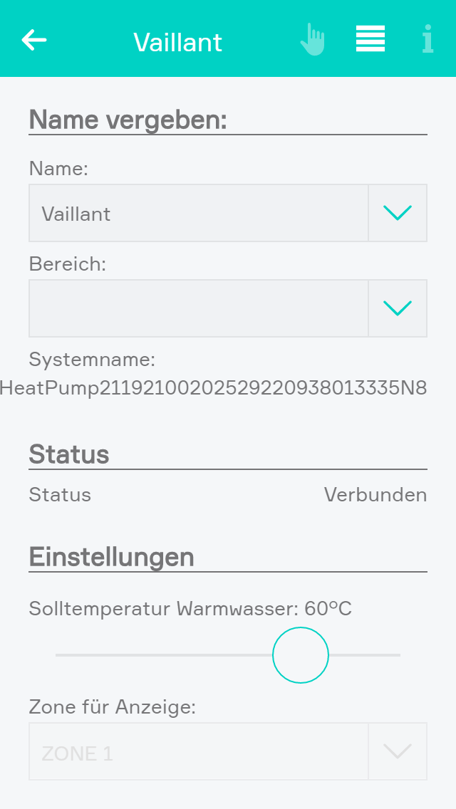 Unter "Einstellungen" kann die Solltemperatur für das Warmwasser angepasst werden und wenn mehrere Zonen vorhanden sind die Zone ausgewählt werden, welche für die Anzeige im Object Panel verwendet werden soll.
