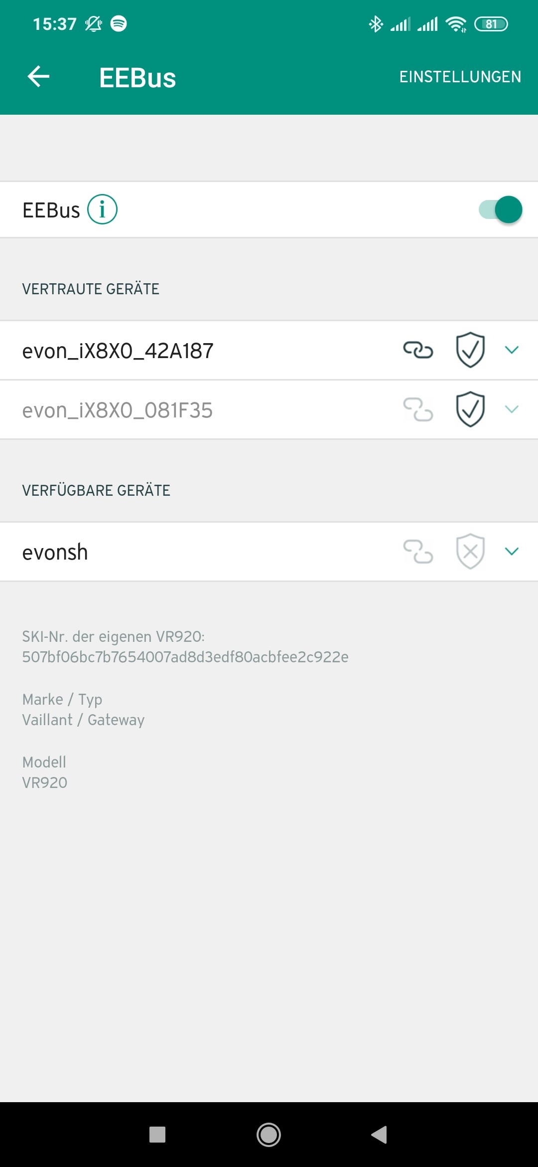Danach kann in der multiMATIC App von Vaillant unter "Einstellungen" - "Anlageneinstellungen" - "EEBus" das evon Smart Home zu den Vertrauten Geräten hinzugefügt werden.