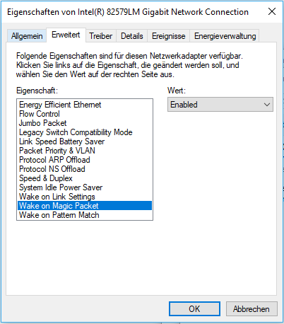 Die Wake On Lan Funktion muss bei einigen Geräten erst aktiviert werden. Als Beispiel wird das Aktivieren der Funktion auf einem Windows-PC erklärt. Unter Systemsteuerung -> Netzwerk und Internet -> Netzwerkverbindungen -> Adapter auswählen -> Eigenschaften -> Konfigurieren... -> Erweitert -> Wake on Magic Packet -> ENABLED.