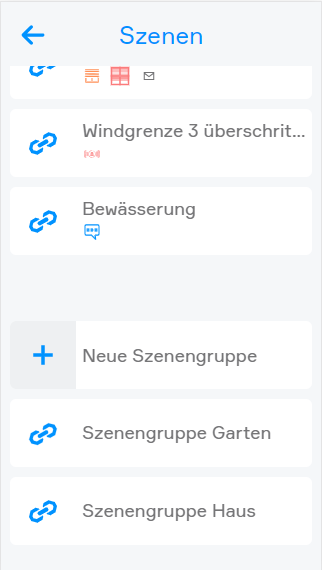 Um eine Szenengruppe zu erstellen klicken Sie auf das Element „Neue Szenengruppe hinzufügen“. Danach öffnet sich ein Panel in dem Sie dieser Gruppe einen Namen (z.B. „Garten“), Farbe und ein Icon zuweist.