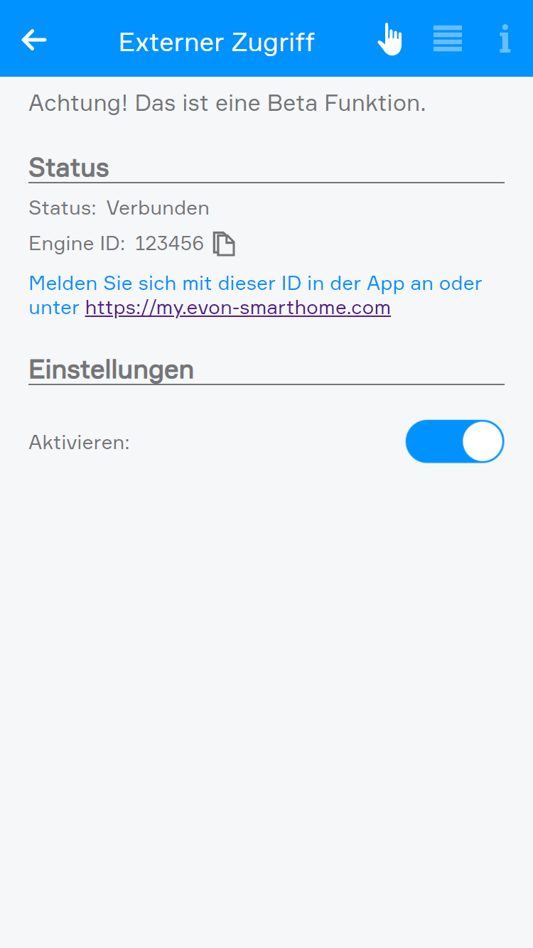 Hier können Sie einstellen, ob Sie über das Internet Zugriff auf Ihr evon Smart Home haben. Haben Sie den externen Zugriff aktiviert, können Sie mit Ihrer evon Smart Home Id von überall auf Ihr evon Smart Home zugreifen. Ihre Daten werden hierbei zwar über das Internet kommuniziert, diese Verbindung ist aber verschlüsselt (https) und es werden nirgends Daten zwischengespeichert - Das Sicherheitsniveau entspricht dem von aktuellen Telebanking-Systemen.