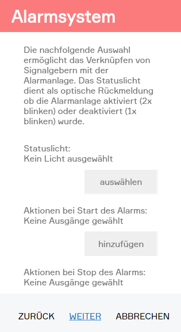 Die Auswahl im nächsten Konfigurationsschritt ermöglicht das Verknüpfen von Signalgebern mit dem Alarmsystem. Das Statuslicht dient als optische Rückmeldung ob das Alarmsystem aktiviert (2x blinken) oder deaktiviert (1x blinken) wurde.