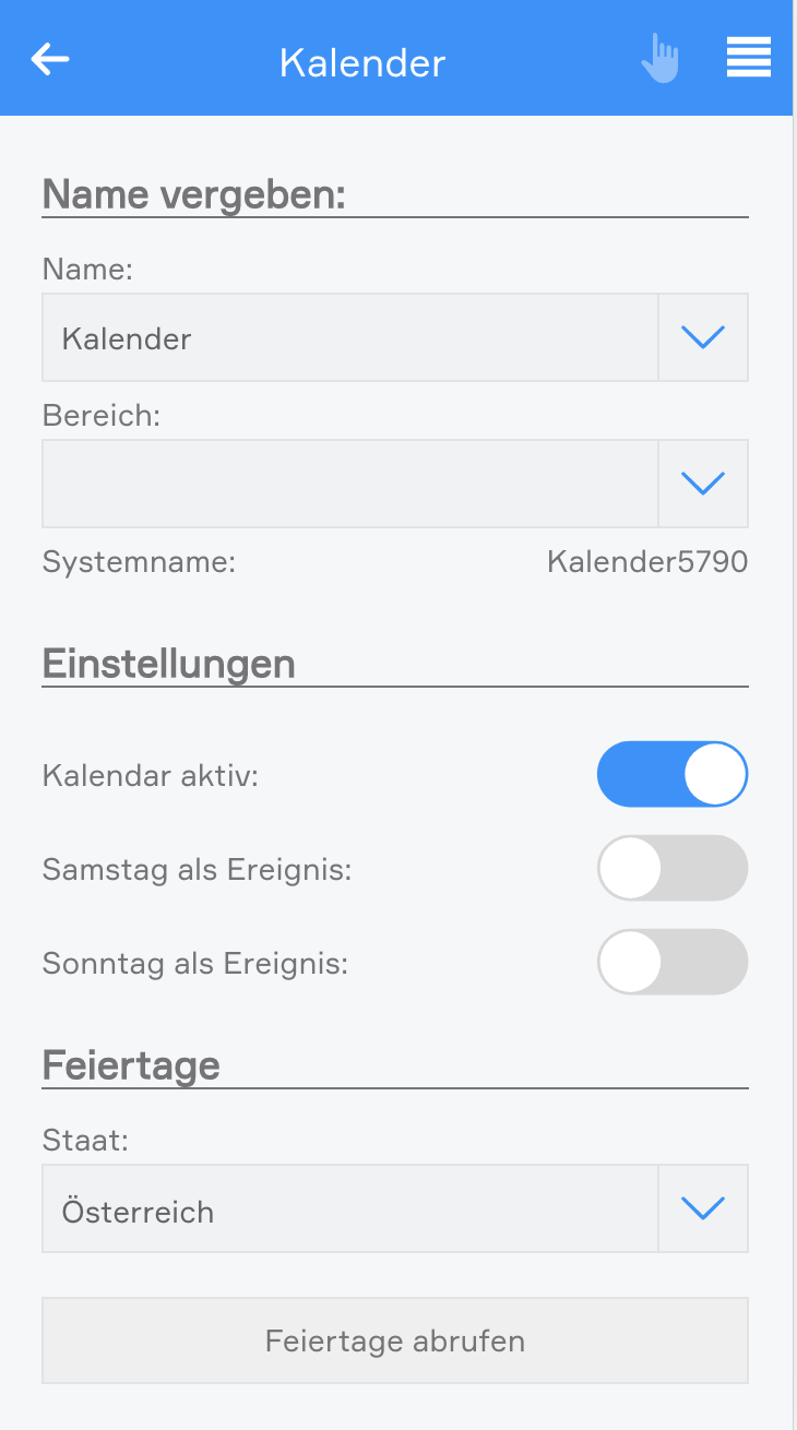 Nach erfolgreicher Erstellung eines Kalenders kann dieser im Parameter Panel konfiguriert werden. Dabei kann dieser wie gewohnt benannt und einem Bereich hinzugefügt werden.