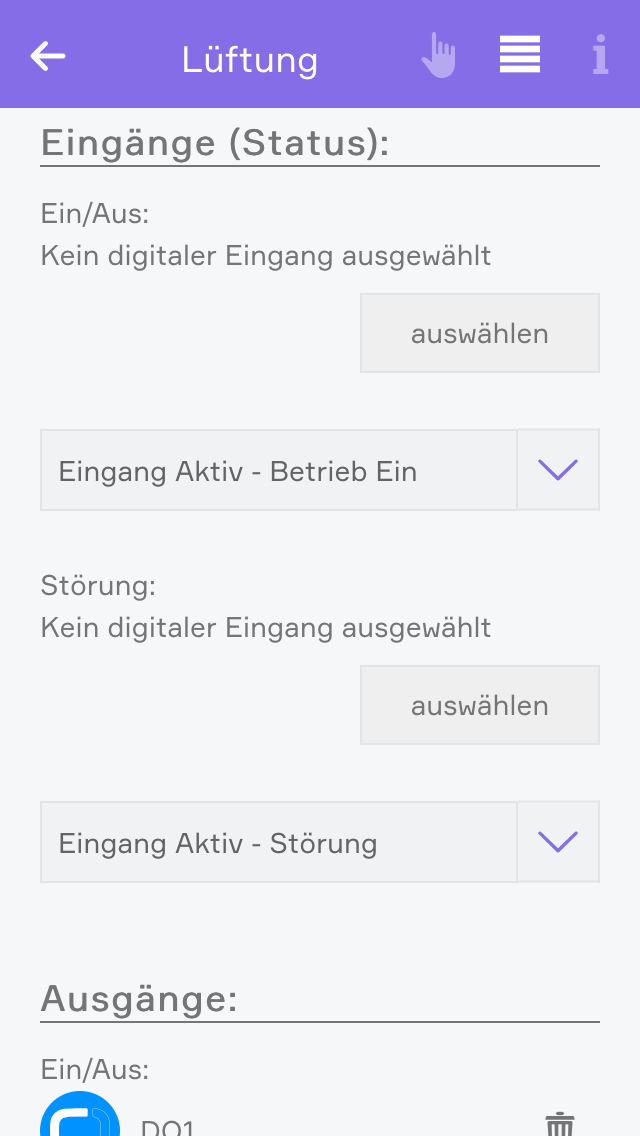 Die Verwendung der digitalen Eingänge ist für den Betrieb der Lüftungs-App nicht zwingend erforderlich. Sollten Sie den Eingang für den Betriebsstatus nicht konfiguriert haben, wird für den angezeigten Wert der aktuelle Zustand des entsprechenden digitalen Ausgangs verwendet.