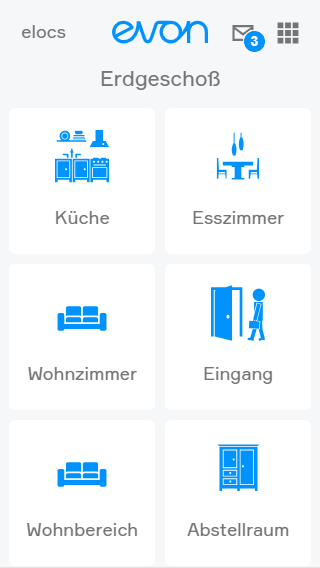 Nach den Favoriten befinden sich Ihre Bereiche. Zuerst werden Ihnen Ihre Stockwerke angezeigt (im Bild Erdgeschoß) und darunter Ihre Bereiche und Räume. Es werden jedoch nur die Bereiche angezeigt, in denen sich etwas befindet. D.h. wird z.B. ein Licht dem Raum Wohnzimmer hinzugefügt, wird der Raum Wohnzimmer angezeigt.