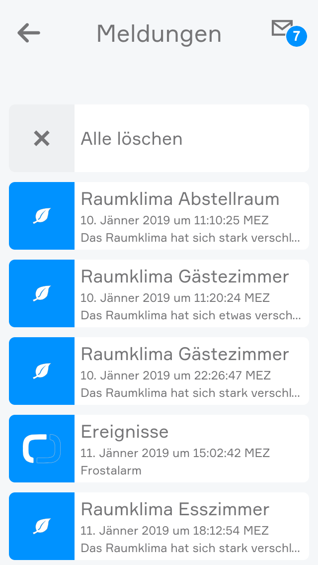 Je nachdem, wie Sie auf Ihr System zugreifen, gibt es unterschiedliche Formen von Benachrichtigungen. Wenn Sie über die evon Smart Home App oder über einen Webbrowser auf Ihrem System zugreifen, erhalten Sie neue Benachrichtigungen direkt in der Visualisierung. Alle gesammelten ungelesenen Benachrichtigungen finden Sie über den Button mit dem “Brief Symbol” auf der Hauptseite.