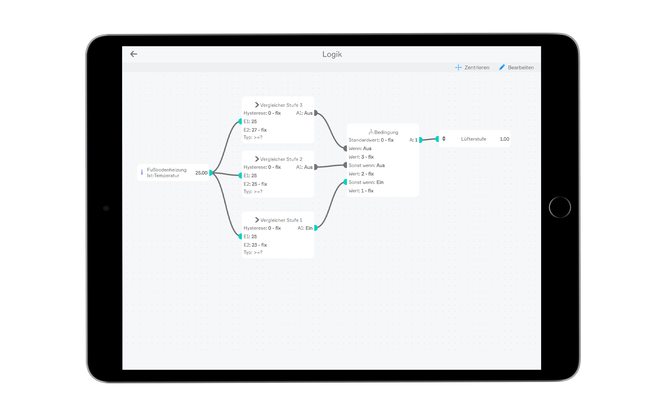Der neue Logik-Editor ermöglicht eine einfache und übersichtliche Erstellung von komplexen Logik-Programmen. Über eine intuitive Oberfläche, können Bausteine per drag&drop hinzugefügt, parametriert und miteinander vernetzt werden. Jedes Logik-Programm kann weiterhin auch in der gewohnten mobilen Ansicht geöffnet und bearbeitet werden.