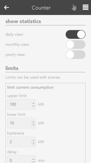 The wind alarm settings let you define a wind speed above which an alarm is triggered. You can also define hysteresis so that the wind alarm does not trigger and end continuously should the wind speed oscillate around the alarm value. If you want that the wind alarm is active only after a certain time, then you need to enter a delay. This means that this time must be longer than the time set for “wind speed alarm”, so that a wind alarm is triggered.
