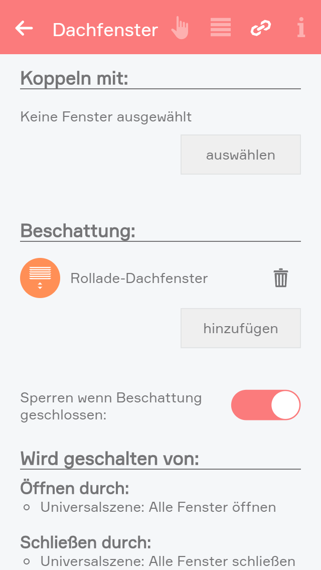 To create an electric window, open the app “shading” and select the blind the window is connected to. Navigate to the parameter panel and select the “type” “window”.