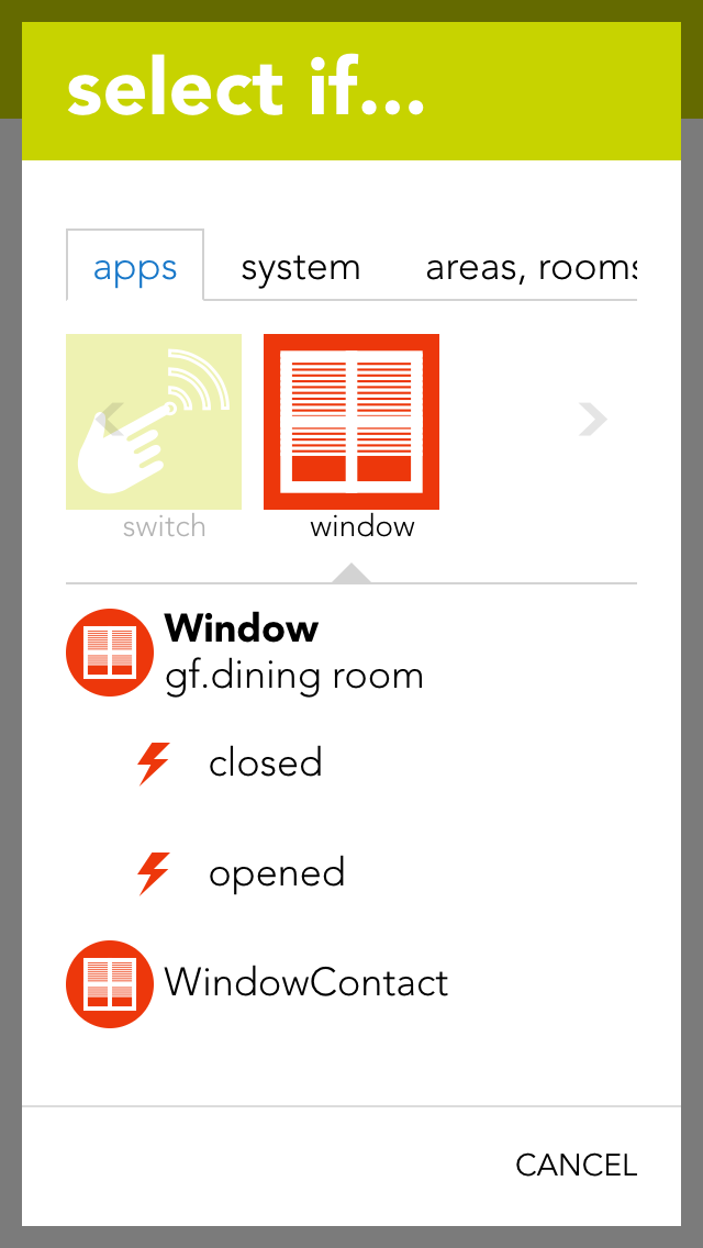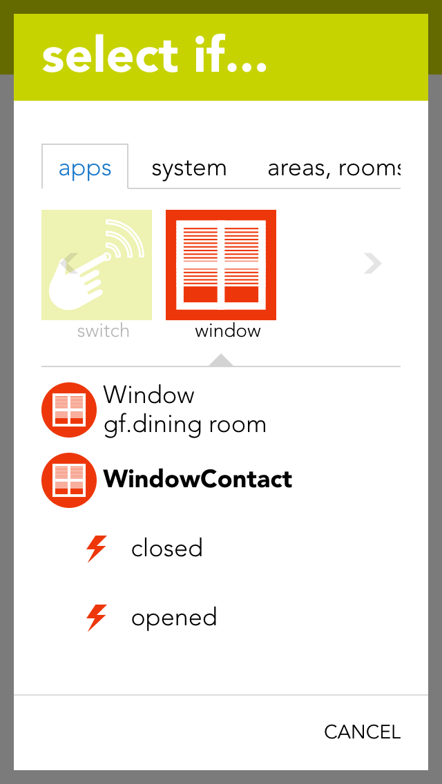 A scene lets you react to the opening and closing of a window by selecting the triggers “has been opened” or “has been closed” in the “IF…” statement and then selecting what should happen in the “THEN ..” statement.