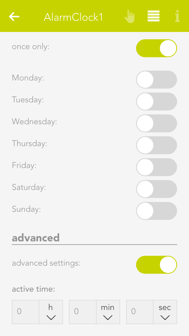 The app “alarm clock” lets you create an alarm clock that goes off at the time you define and is shut off after a certain time. An alarm clock is intended to be used with a scene to react to the alarm and the end of the alarm.