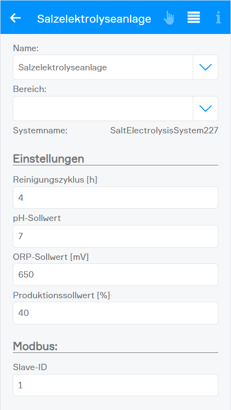 Im Parameter Panel können Sollwerte für ph-Wert, ORP-Wert, Reinigungszyklus sowie Produktionssollwert eingestellt werden. Sollte sich die Slave-ID des Geräts ändern, kann die Einstellung hier verändert werden.