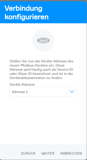 Start des Salzelektrolyseanlagen-Wizards nachdem Salzelektrolyseanlage im Pool-Wizard ausgewählt wurde. In diesem Schritt ist die Schnittstelle, an die die Salzelektrolyseanlage angeschlossen ist, auszuwählen.