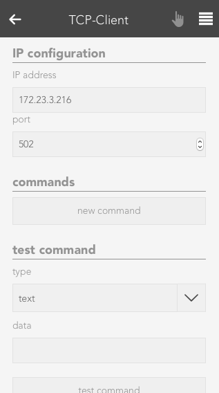 Before the TCP Client can communicate, you have to enter a valid IP address in the settings. To do so, open the Parameter panel of your newly created TCP Clients and enter the IP address and the port of the desired device.