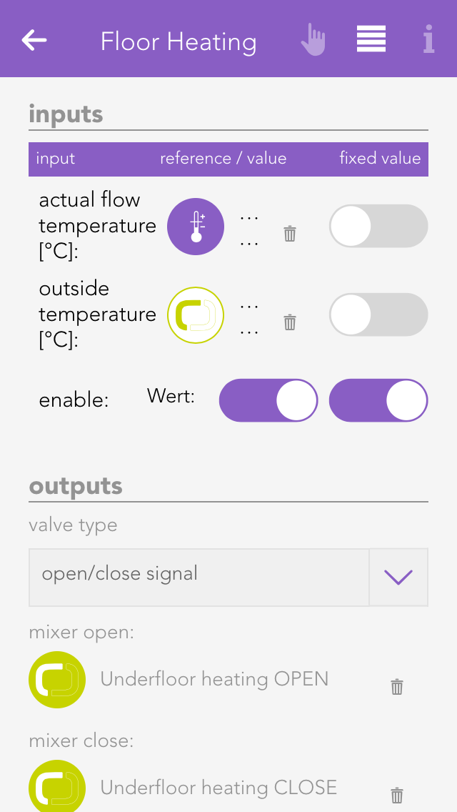 The “mixer circuit control” app is an external temperature heating control loop. The “mixer circuit control” is used to configure and control 3-way heating mixer valves.