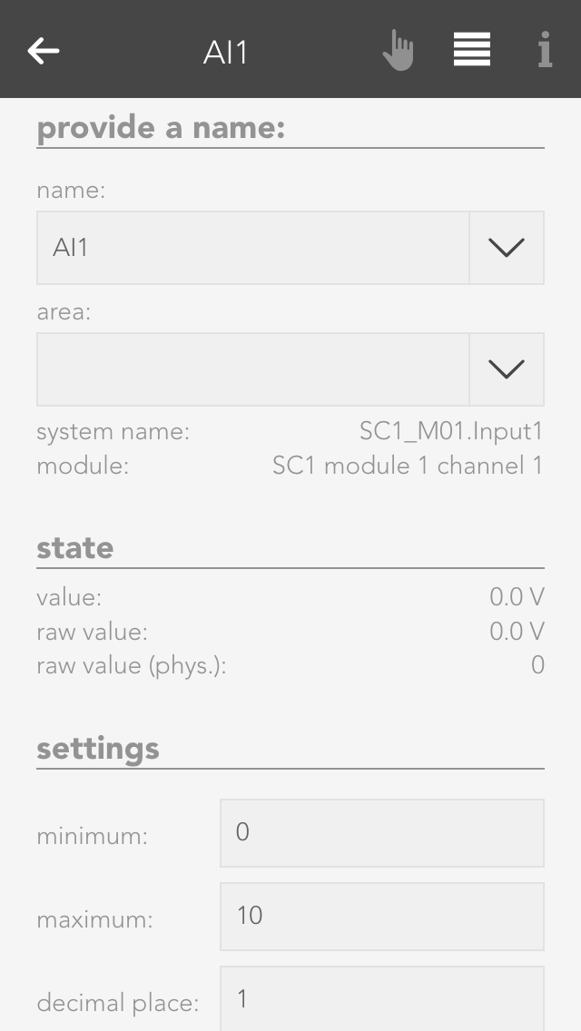 An analog input can measure voltage in the range 0-10V. This voltage is then scaled to the range defined by the user. This value can be used by the user for calculations (using logic), or simply to trigger scenes if the value exceeds or falls below certain (definable) limits.