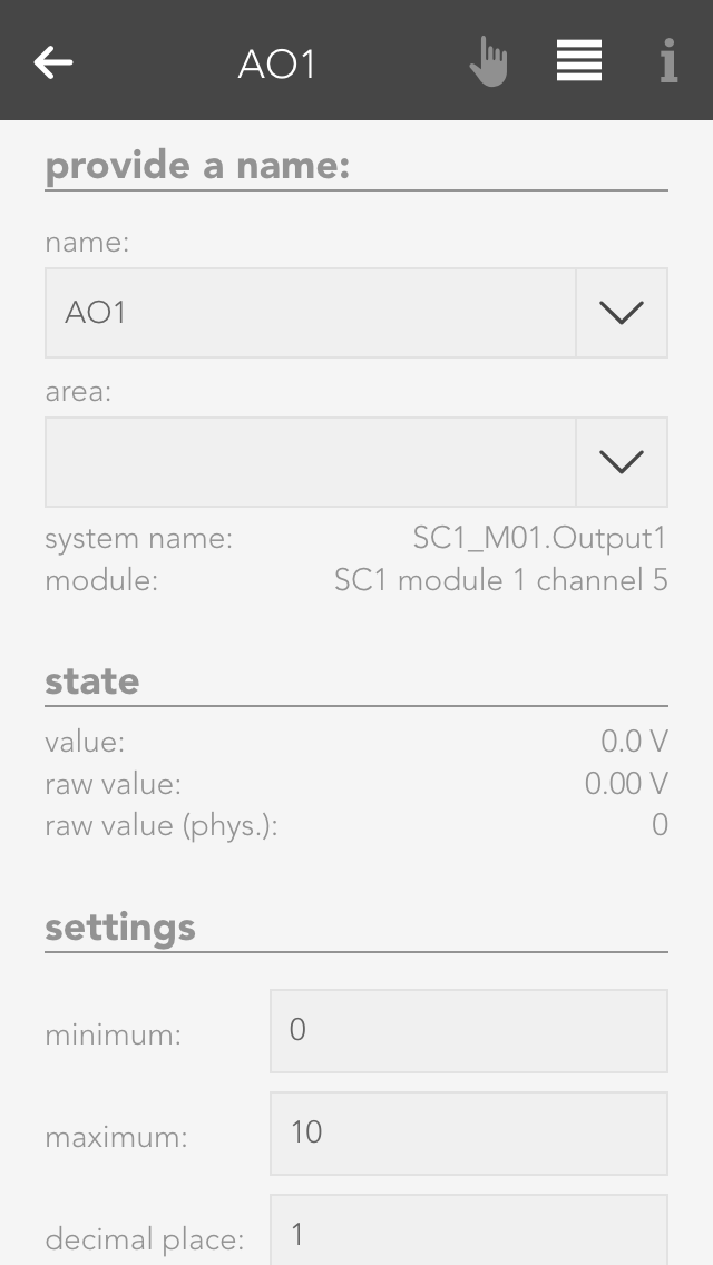 An analog output outputs voltages in the range 0-10V. To do this, enter a value in your defined area and this will be output as a voltage between 0-10V.