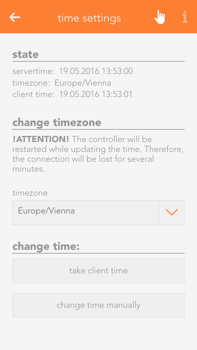 The time zone lets you allocate the desired time zone to your controller. The item “set time” allows you to set the time in the controller. The button “use client time” allocates the time used by your device (mobile phone, tablet) to the controller. The button “set time manually” lets you set the time and the date for your controller yourself.