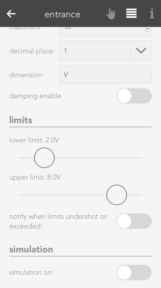 If you wish to simulate the value for an analog input, this is easily done by activating the option “simulation on” in the operator panel and selecting the desired value in the slider. This can be useful if you have defined a scene you wish to be carried out if a limit is exceed and you wish to test what happens.
