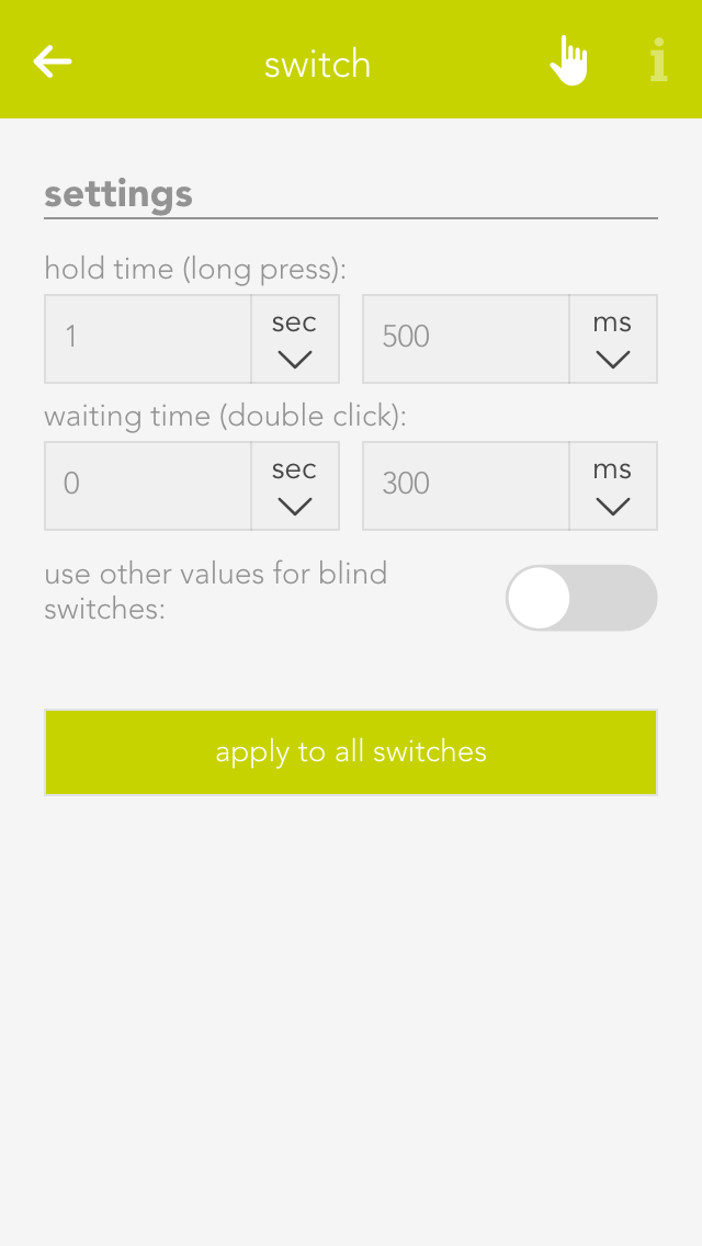 This setting determines whether this light is controlled by a switch or a presence detector. If you select “presence detector”, the settings to adjust the time the light is switched on are displayed.