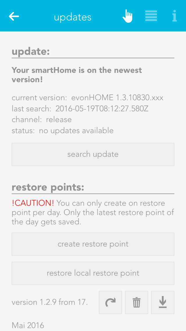 Furthermore, you can create recovery points, which allow you to reset your evonHOME to an earlier state if you have inadvertently maladjusted parameters. Such recovery points are recommended once you have named all your lights, blinds, etc. and have set them up as you require. Use the button “reset to factory setting” to reset your evonHOME to the original factory settings.