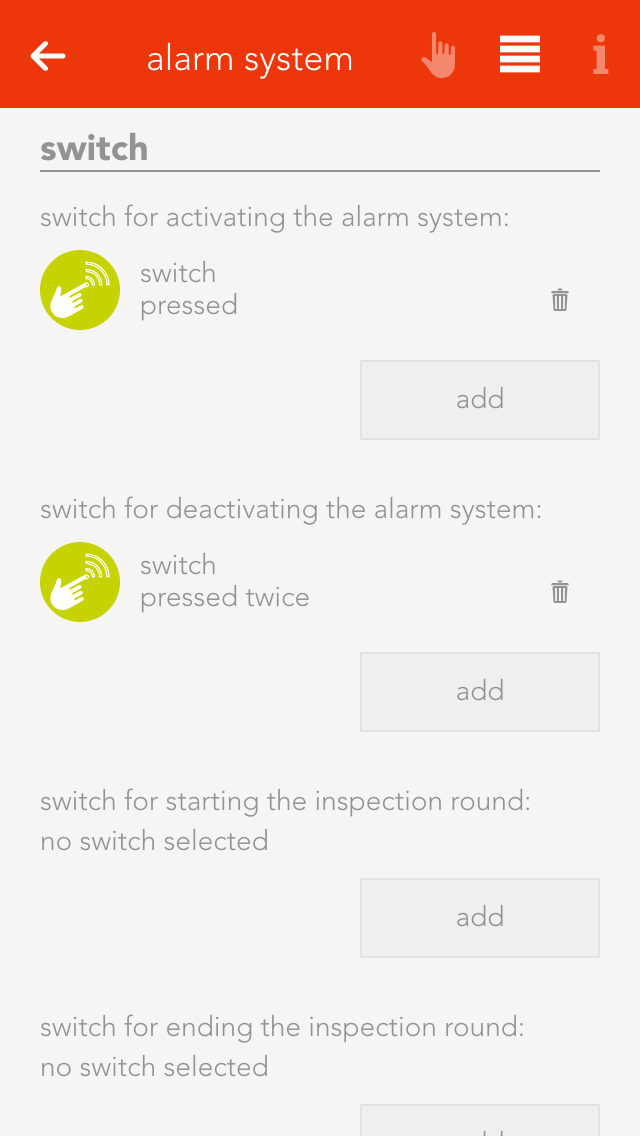 Use the button “add” to select all the actions you wish to happen when an alarm is triggered (e.g. switch lights on, activate siren, etc.).