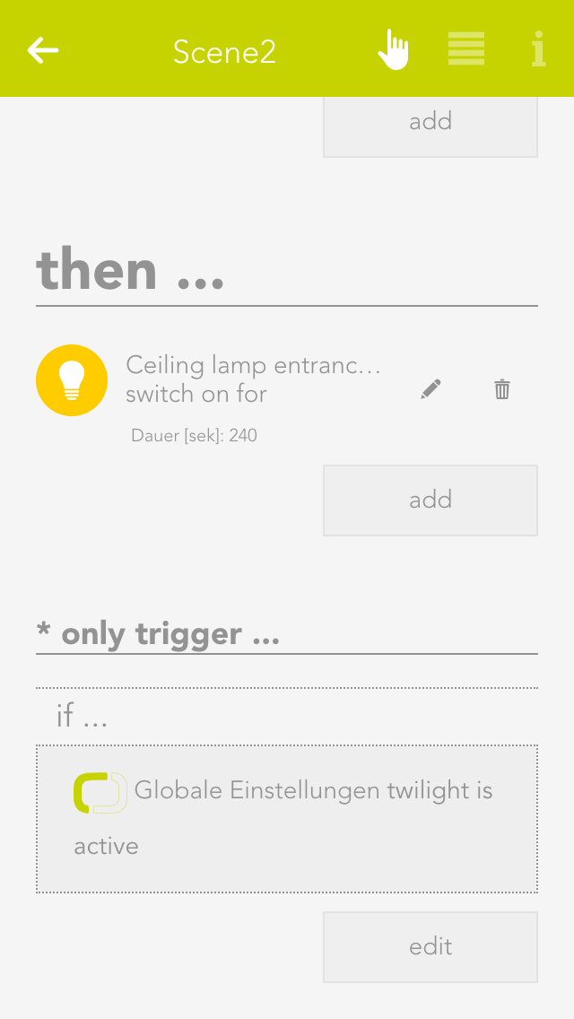 Erstellte Szenen können Sie auch in andere Szenen im "Dann" Bereich verwenden und diese so z.B. auslösen oder deaktivieren.