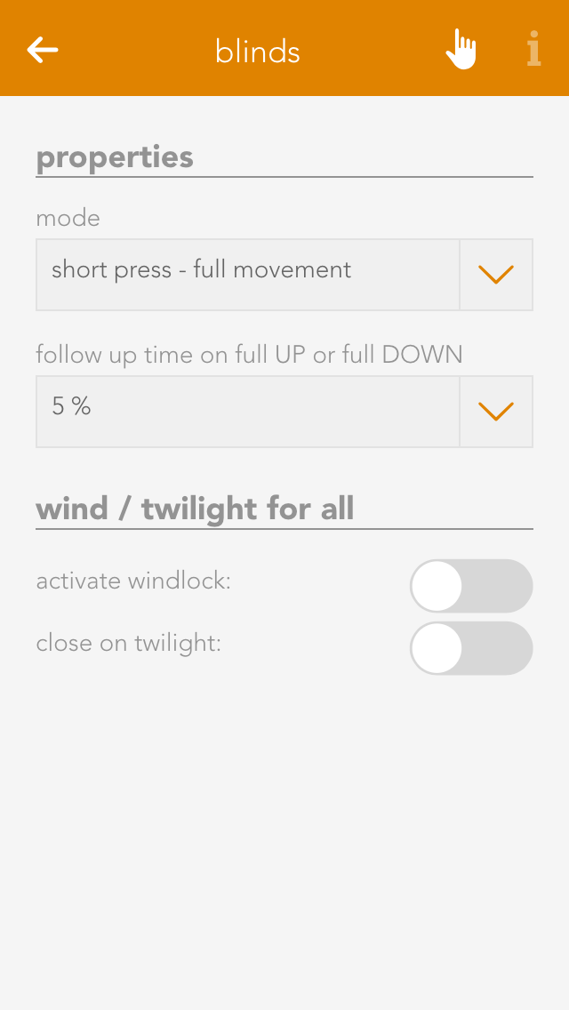 Global settings let you define what is responsible in your evon Smart Home for activating wind, rain, frost, dusk states. For example, if you have connected a rain sensor, this is where you would find the settings for your system to display whether it is raining or not. The global settings can be found under “all apps” – “settings”.