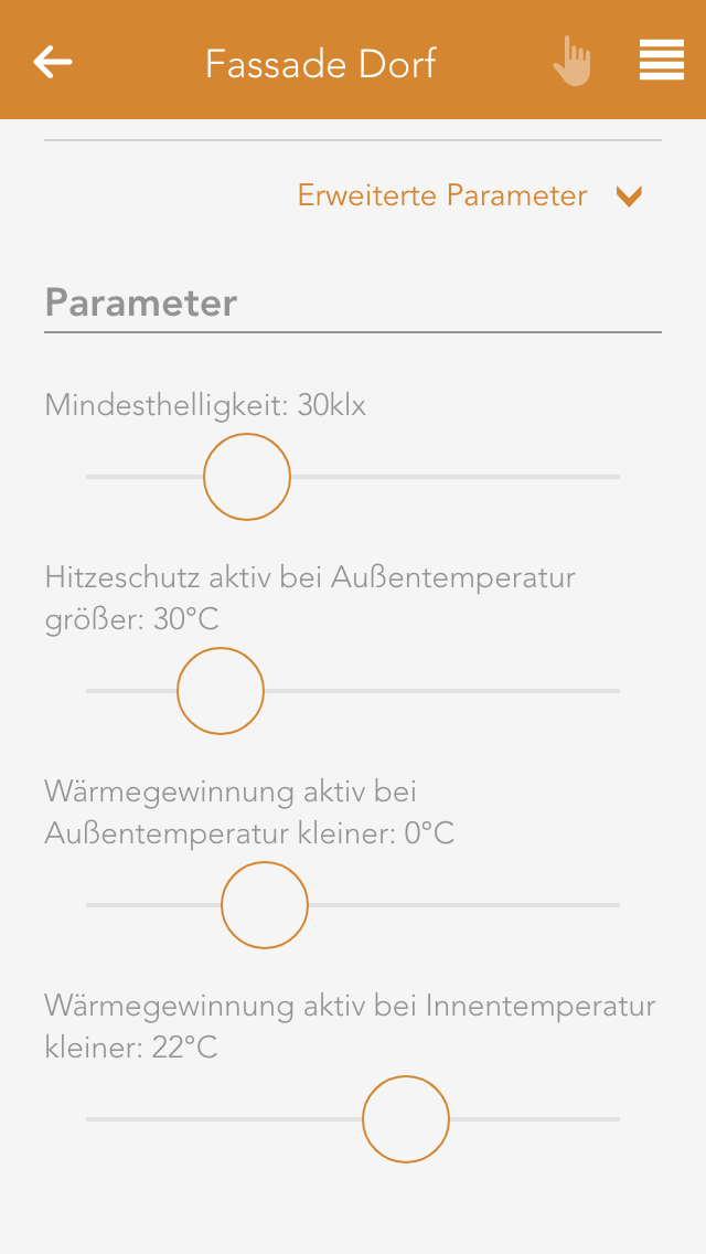 On the bottom of the parameter panel you can set additional parameter. The minimal brightness must be above to control the blinds by the table. Among this value the blinds keeps open.