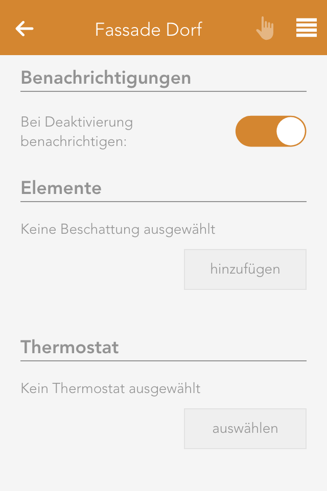 If you also want to use the shading control to use heat of the sun, you can add the inside temperature under „thermostats“. You can also leave this area empty, if you do not want to enable heat using.