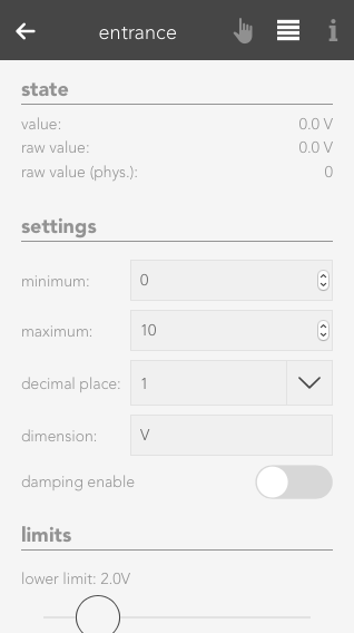 Minimum and maximum limits of the measured value. These inputs must be taken from the description of the sensor used. For example, you wish to measure the humidity in a room and use a sensor with a 0-10V output signal. The sensor documentation tells you that the sensor can measure humidity from 0% to 100%. The minimum limit is hence 0 and the maximum limit is 100.