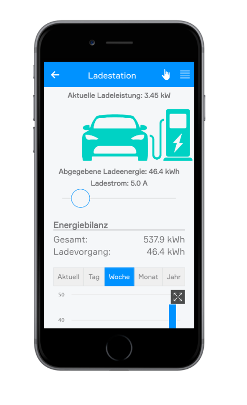 - Anzeigen des aktuellen Ladestatus, der Energiebilanz und von Detailinformationen zur Ladestation und dem aktuellen Ladevorgang