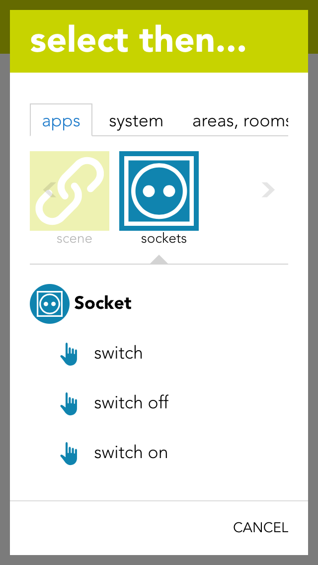 The socket can be used for a scene (in as far as it has been named). In the scene’s “if….”, select the socket and one of the following possibilities: