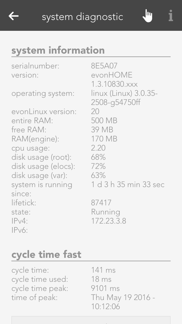 You can also look at cycle times. This is an indication of the load on your evon Smart Home system. You can also see the last five peak values. The cycle time is the time required for a complete run of the program.