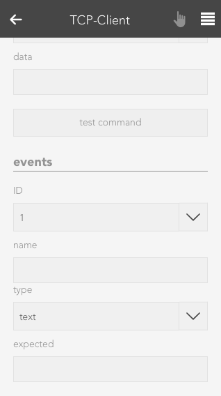 There are some devices, which may frequently send data, without the need for a explicit request (e.g. via a command). For such use cases, every TCP Client has 3 events. For each event, you can set what data you are expecting and their type (text or hex). If an expected event occurs this event will be triggered and can be linked to when creating a Scene.
